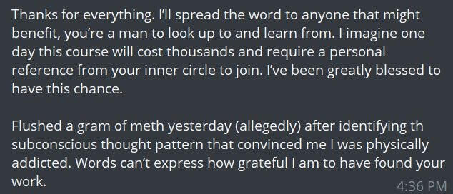 Like I told you, I'm a former drug addict who fucked up many times until getting it right.My advice is not based on mental masturbation or theory.It’s based on my experience of raising up from the lowest point in my life.I walked the walk before talking the talk.